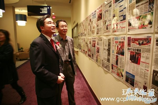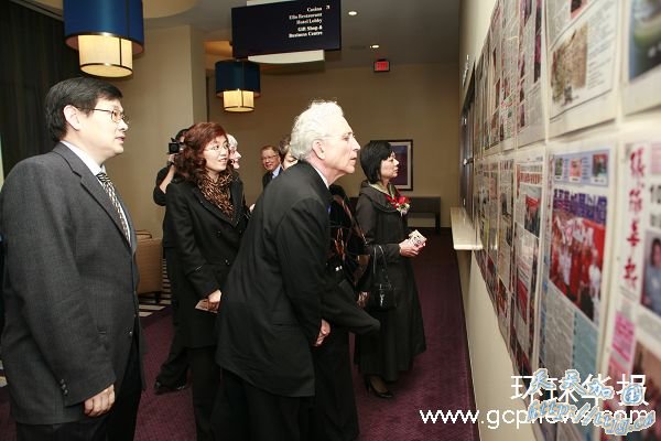 来宾们认真观看《环球华报》十年精彩版面回顾。