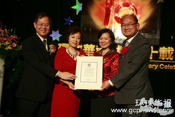 国会议员黄陈小萍向《环球华报》社长张雁致送嘉许奖。