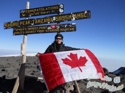 今年7月,许玮玲带着加拿大国旗登上非洲坦桑尼亚的最高峰,也是世界最高的独立山峰之一:乞力马扎罗山峰(Kilimanjaro Uhuro Peak)。站在海拔5895呎的顶峰上,迎着每小时40公里的风速,接近零下30度的气温,当许玮玲张开加拿大枫叶国旗的那一刻,觉得自己真的很 “酷”。