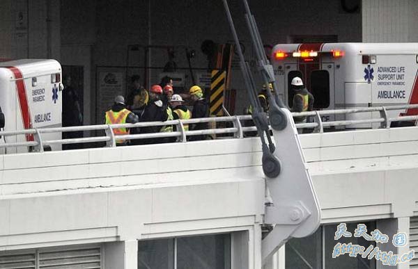 数分钟后,一个工人在加拿大广场(Canada Place)清理五帆顶部时,从十多米高处堕下,目前仍在医院抢救。