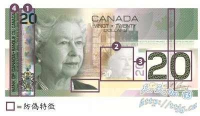 目前流通的加拿大纸钞都有类似的防偽標记。
