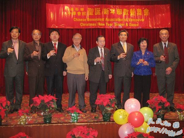 温哥华中华会馆日前举行圣诞/新年联欢餐舞会,图为中国驻温总领事梁梳根(右三)与侨胞恭祝节日快乐。 黄运荣 摄