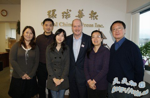 图:省自由党党领候选人麦德庄(Mike De Jong,左三)和前温市议员黎拔佳(左一)与本报员工。 杨栋 摄