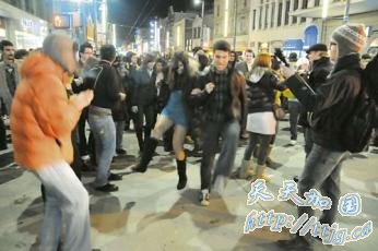 据星岛日报报道,入夜之后,公众开始从四面八方向温市中心汇集。约深夜11时半,固兰湖街(Granville St.)同洛逊街(Robson St.)被庆祝人群挤得水泄不通,寸步难移。多位兴奋的男女更围成小圈子,在吉它伴奏下翩翩起舞,获得众人齐声叫好。