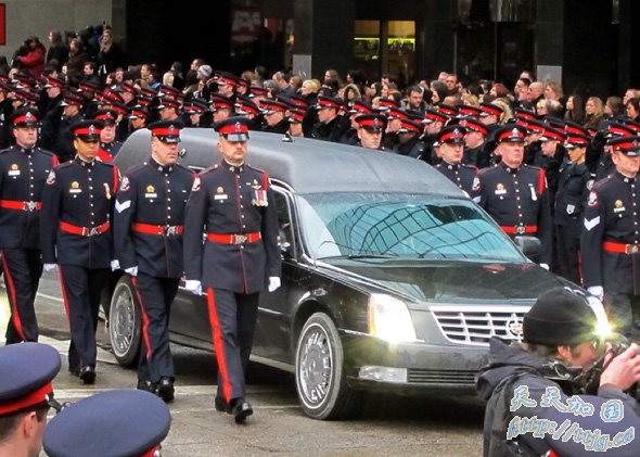大约13,000名穿着整齐制服的警员和来自加国各地的紧急救援人员,在多市市中心列队步往会议中心出席电视直播的丧礼,队伍经过多个街区,街道两旁站满了前来致意的市民。