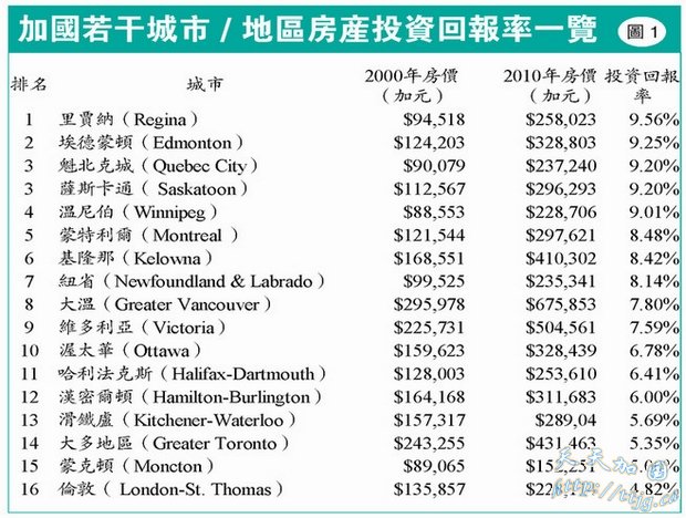 下图是加国若干城市/地区房地产投资回报率一览表:
