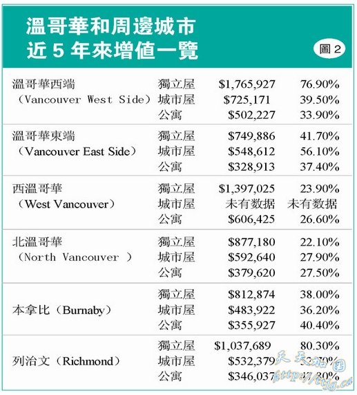 无论是身为屋主的人,还是有意购房置业者,都会想到同一个问题,独立屋、城市屋和公寓,哪一种房子更有升值潜力?那一种房屋更值得买?不少人会想当然地认为,答案肯定是独立屋。大温地产局(Real Estate Board of Greater Vancouver)的最新数据显示,位于不同的城市、区域,各类别的房屋增值快慢和高低存在差异,读者不妨参考以下图表,从中依照自家房产或心仪物业所处的地点寻找答案。