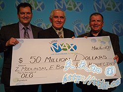 来自多伦多市中心一家面包房的3名师傅(下图)昨天到安省博彩局领取5千万Max头奖,他们是上周五(11日)Lotto Max头奖的中奖者,每人将分享$16,666,666奖金。