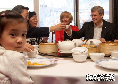 (上图:17日上午,哈珀总理及夫人在列治文一中式酒楼与华人喝早茶。总理办公室图片)