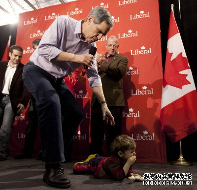 自由党叶礼庭20日在诺瓦斯高沙的亚茅斯演说时,2岁儿童贾克在台上乱跑时摔倒在地,叶礼庭立即俯身察看。(加通社)
