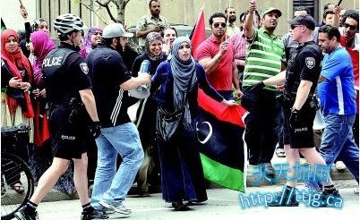 利比亚领袖卡扎菲(Moammar Gadhafi)的支持者与反对者周五在位于渥太华市中心的利比亚大使馆附近聚集,警方需将该两批人士分隔。