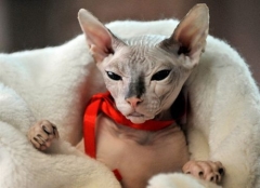 11月7日,在吉尔吉斯斯坦首都比什凯克举行的猫展上,一只系着缎带的加拿大无毛猫躺在毛毯中。 11月7日,在吉尔吉斯斯坦首都比什凯克举行的猫展上,一只系着缎带...