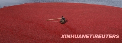 10月21日,在加拿大芒索地区的阿托卡农场,一名工人采用水收法收获蔓越橘果实。 蔓越橘又称小红莓、蔓越莓,主要产地局限于美国和加拿大的部分地区,其果实可以...
