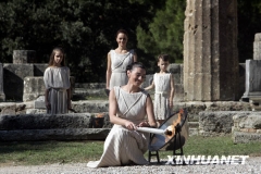 10月21日,扮演最高女祭司的希腊女演员玛利亚娜芙普利都(前)在彩排中顺利取得火种。 当日,2010年温哥华冬奥会圣火采集仪式彩排在希腊古奥林匹亚遗址赫拉神庙...