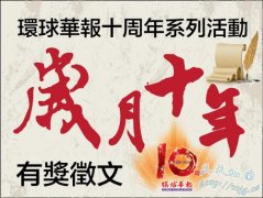 【环球华报专讯】由《环球华报》及环球华网共同举办的岁月十年有奖征文比赛,自推出以来反映热烈,投稿者踊跃。参赛者有未足十岁的孩童,也有年过八旬的长者。...
