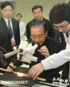 12月11日,中共中央政治局常委、国务院总理温家宝到中国气象局考察。这是温家宝在国家气候中心实验室用显微镜观看通过树木年轮研究历史上气候变化的情况。新华...