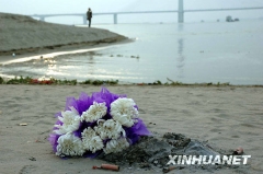 10月26日,江滩边摆放的鲜花寄托着人们对年轻英雄的怀念。 24日,面对落入湍急江水的少年,长江大学14名大学生不顾自身安危,纷纷跳入水中救人。手挽手组成的人...