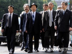 10月23日,在日本首都东京,幸存劳工邵义诚(前左二)、死亡劳工遗属杨世斗(前左三)和曲启杰(前左一)与代理律师内田雅敏(前右一)走向法院。二战时曾强掳...