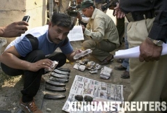 10月15日,在巴基斯坦旁遮普省首府拉合尔,警察搜集武装分子的武器弹药。巴基斯坦警方说,巴东部旁遮普省首府拉合尔多处目标当日同时遭到武装分子袭击,已造成...