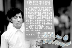 吴先生拿着征婚牌希望遇到真命天女 华龙网8月23日报道 从21岁就开始相亲,今年35岁的吴先生至今还单身。多次相亲经历之后,吴先生意识到,要找到和自己情投意合的人,还得把自己的择偶标准重新修订。昨天,他带着自己的招亲牌来到解放碑,举着牌子寻觅他的真...