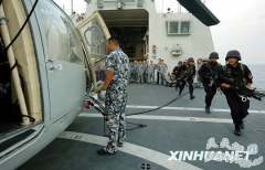 核心提示:21日,中国海军第三批护航编队“舟山”舰在亚丁湾海域执行中国海军第97批护航任务时,利用舰载直升机运送4名特战队员,前往浙江省舟山市卫丰船务有限公司的“卫远”号商船,实行随船护卫。...