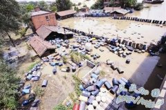 湖北汉江边一仓库被淹 数千只化工桶泡江中