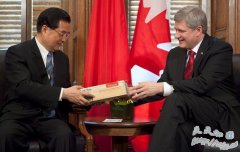 加拿大总理哈珀向中国国家主席胡锦涛赠送魁北克出产的枫叶糖浆。 加拿大总理哈珀与中国国家主席胡锦涛举行双边会谈,相谈甚欢。...