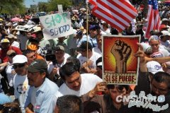 当地时间5月29日,数万名抗议者在美国亚利桑那州凤凰城举行声势浩大的游行示威活动,抗议亚利桑那州通过全美最严苛的反非法移民法案,两个月后,该法案将正式生...