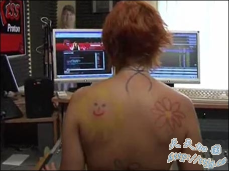 维罗妮卡坦诚,因为打赌输了,她不得不在电台节目里全裸主持三个小时,她的一名女同事帮她在画上一幅由俏皮小花做连接的绿色比基尼和灰白条纹内裤,她的背部还画有一只狗和太阳的图形做点缀,右小腿也有鲜艳的条纹图形。