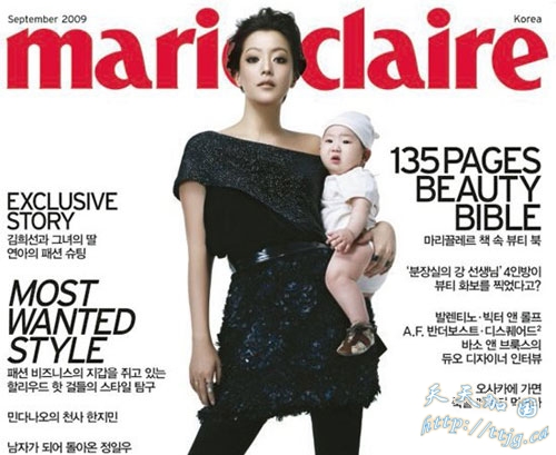 韩国女演员金喜善抱着女儿一起为某杂志拍摄了封面照。