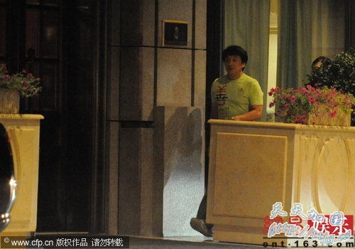 跑车在酒店门前停好后,车上的那位女孩先下了汽车,记者看见她身材高挑,容貌秀丽,打扮入时,女孩没有走进酒店,而是在车旁等成龙下车,成龙下车后招呼着女孩一前一后快步走进了酒店,当天成龙穿着一件绿色的T恤,显得格外年轻,精神饱满。