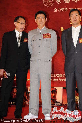 电影《建国大业》香港首映式昨天(9月20日)举行,导演韩三平、黄建新,演员唐国强、张国立、刘德华出席,香港特区行政长官曾荫权也出席了首映式。近日因自爆与朱丽倩结婚的天王刘德华当日身穿灰色中山装出席,十分帅气,但是在现场只说影片,避谈任何私人话题。