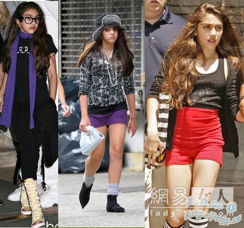 右图:红色高腰短裤,黑白条纹肩包和及膝袜加上披肩长发,小辣妹新鲜出炉
