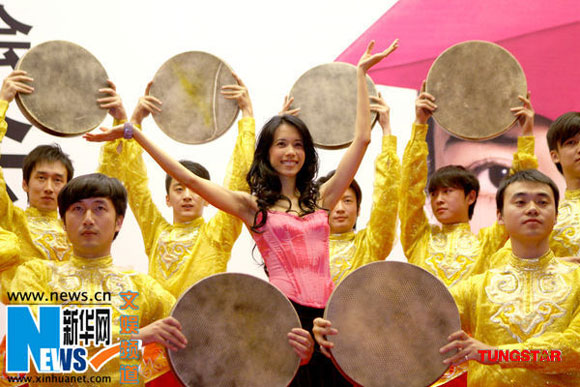 莫文蔚踩着鼓点摆造型。(新华网/图)