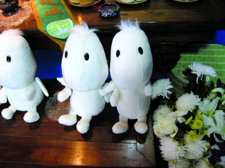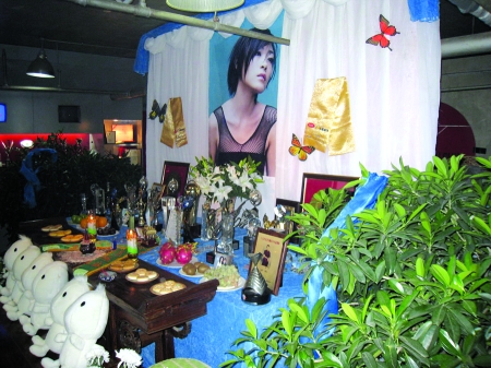 记者留意到,在灵堂的一面墙上陈列着她生前获得的奖杯和各种证书,而另一面则是一块蓝布,有歌迷来祭奠时,把自己想对陈琳说的话写在万次贴上,然后贴在蓝布上。而一排白色的卡通玩偶也非常抢眼,工作人员告诉记者,这是陈琳生前非常喜欢的“天使”,她以前开演唱会的时候,曾经送给过粉丝们。工作人员称,整个悼念室都是沈总一手布置的,他想让人们“带着微笑怀念爱笑的陈琳”,希望气氛温暖。