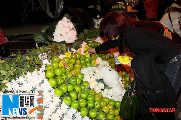 竹书文化公司外面的玻璃墙上贴满了陈琳的大幅海报,在大门口的角落里,有着“默默祝福”几个字,北京冬日的寒风中,这几个字让人看后特别感触。当记者走进悼念室里,立刻听到了和尚诵经的音乐,一个小型灵堂就正对着门口。陈琳生前最爱吃的火龙果和糕点都被摆放在桌上,桌子两旁是白色的康乃馨。里面的工作人员听闻记者来自陈琳的家乡,立刻起身迎接,记者表示在来的路上一直想找家花店,但始终都没看到,该名工作人员说:“这几天来祭奠陈琳的很多人都没有带花,你可以上一炷香。”记者也拿起3支香,为陈琳点上,在心里默默祝愿她可以忘却人世间曾经的伤痛。