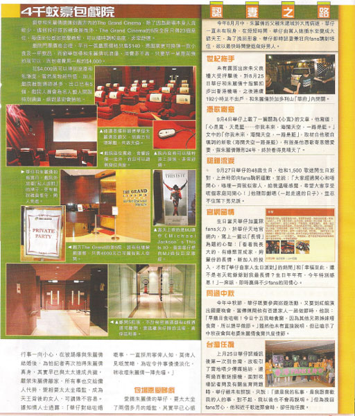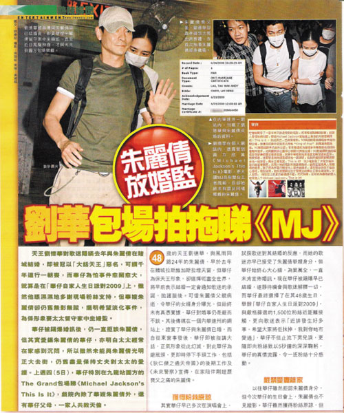 虽然未能与朱丽倩光明正大地去逛街,但刘德华仍想办法为太太解闷。5日,华仔带朱丽倩包场看迈克尔·杰克逊的纪录片《This Is It》,同行的还有华仔父母、助手及公司工作人员10多人。戏院门外放上私人派对的牌子,并有戏院工作人员看守,让华仔可以安心地与家人共享天伦之乐。