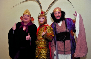 昨日,扮演唐僧的陈司翰缺席了活动,费振翔、谢宁和牟凤彬三人分别以孙悟空、猪八戒和沙僧的造型出现在媒体面前,造型与老版《西游记》颇为接近。针对老版特效不够逼真的问题,程立栋称,浙版花费了将近一千万元制作特效,每集的特效场景达到1/5。