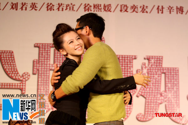 在主持人的调侃下,片中饰演情侣的徐若瑄、吴彦祖现场热拥,付辛博与诗雅也在闪光灯中拥抱彼此,大显温情,落单的井柏然则调皮的发表了声明,要把自己的拥抱留给在香港的Angela Baby,二人的超高人气带动起全场高潮。