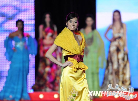 代表中国参赛的新疆籍选手王巍(中)着晚装参加决赛。