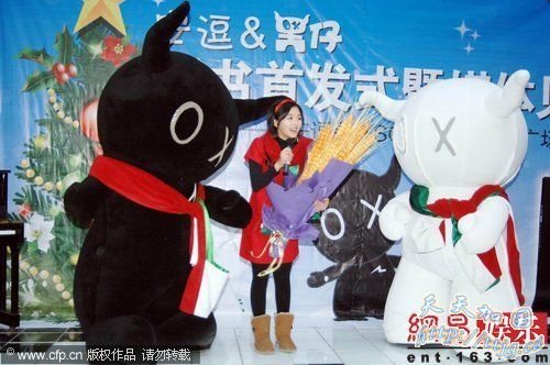 网易娱乐12月26日讯 (图文/CFP)刘德华“儿子”安逗、黑仔首本新书首发式及签售会25日举行。张含韵作为嘉宾出席,被卡通公仔左右献吻。