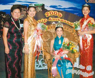 华商会2009年华埠亲善小姐由现年20岁的林晨谕(右二)赢得后冠,郑莉丽(右一)、陈永欣(左二),分别获得第二名和第三名。左一为华商会会长梅施美英。
