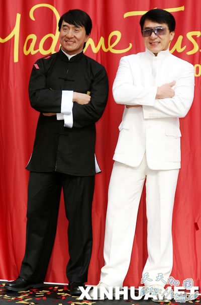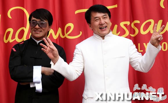 1月11日,在美国加利福尼亚州好莱坞杜莎夫人蜡像馆,国际影星成龙(右)与自己的蜡像合影。当天,成龙的蜡像在好莱坞杜莎夫人蜡像馆亮相。新华社发