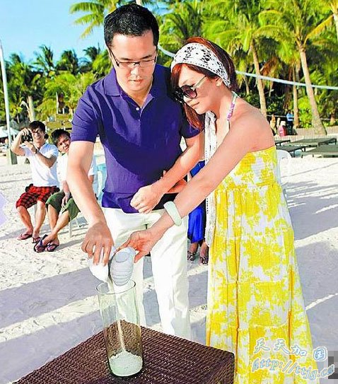 梁静茹(右)和Tony将白沙倒进玻璃瓶中,象征“你泥中有我,我泥中有你”。