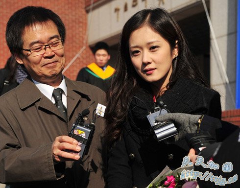 2月19日上午,中央大学的2009年度毕业典礼在首尔黑石洞中央文化艺术馆大剧场内举行。图为,韩国歌手兼演员张娜拉和父亲朱虎声(本名张然教)一起合影留念,并在回答记者问题。