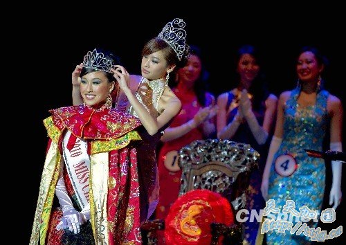 当地时间2月20日晚,2010年度全美华埠小姐选举在旧金山艺术宫举行。来自旧金山的18岁斯坦福大学生李万晴轻松夺冠。图为上届华埠小姐冠军吴欣云为李万晴加冕。 中新社发 陈钢 摄