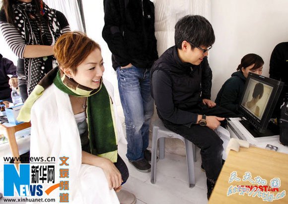 郑秀文回看拍摄效果。
