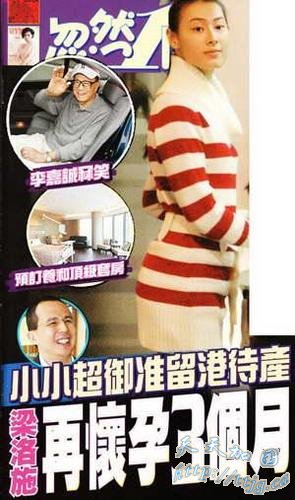 不过,事实却是梁洛施不但母凭子贵,进驻李家豪宅,更进一步获得男友宠幸,再怀“李种”。据知梁洛施已经怀孕3个月,预产期为十月初。而十分疼爱女友的李泽楷,更开心的预留了养和医院顶级靓房给女友生产之用,尽显细心。