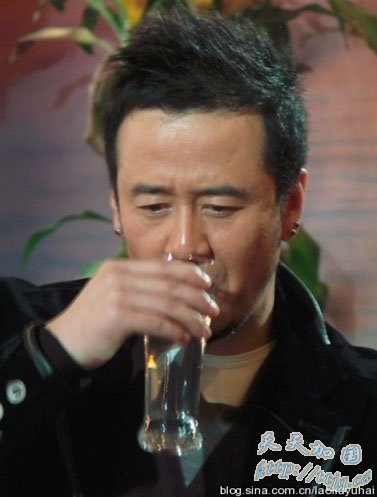 图为杨坤在湖南卫视《零点锋云》节目录制现场频频喝水