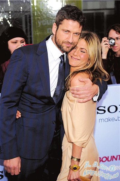 电影《赏金猎手》16日在纽约举行首映式。主角詹妮弗·安妮斯顿与杰拉德·巴特勒相拥登场,甜蜜举动宛如情侣(图)。